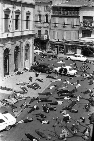 17 mai 1973. Des centaines de personnes couchées au milieu de la rue et sur les trottoirs, comme si elles étaient mortes, voitures arrêtées portières ouvertes. Cliché pris lors de l'opération médiatique « Mazamet ville morte » organisée par la Sécurité routière. Durant 15 minutes de nombreux habitants de cette ville du Tarn qui comptait alors environ 16 000 âmes, se sont couché sur la chaussée pour symboliser les 16610 personnes tuées sur les routes de France en 1972 (photo ci-dessous).