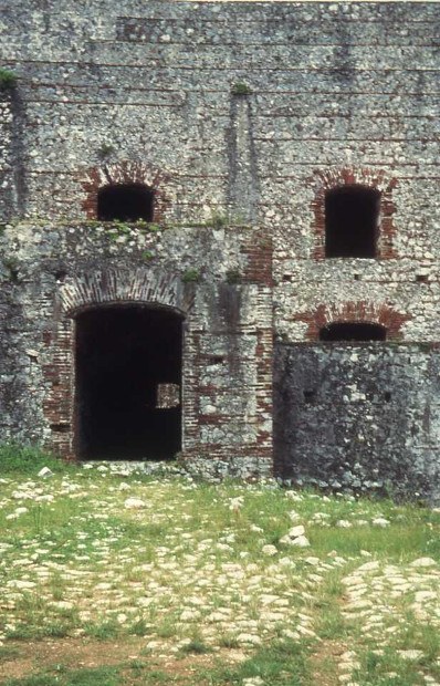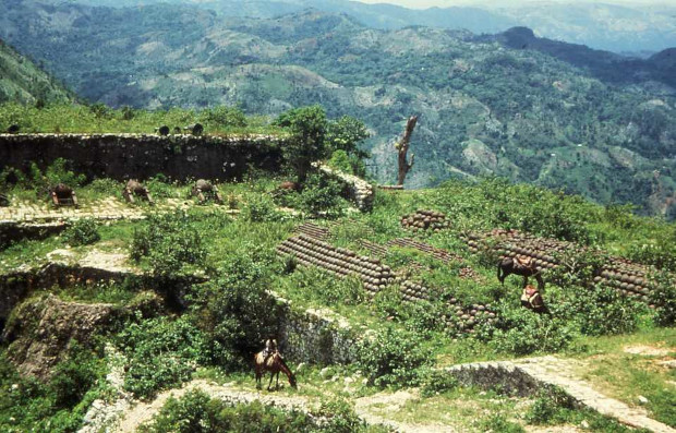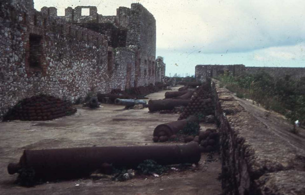A une quinzaine de kilomètres en effet, se trouve « la Citadelle La Ferrière ». Je m’y rend en bus bariolé, comme ils le sont tous. Pour y arriver, on passe d’abord devant les ruines du « Palais Sans soucis » qui connut ses heures de gloire. Les derniers kilomètres escarpés se font à pieds ou à dos d’âne. Aucun blanc et peu de visiteurs haïtiens. Les guides et les âniers ne font pas fortune. Construite par le roi Henri Christophe, pour abriter une garnison de 2000 soldats, mais trop loin de la mer, la Citadelle n’a jamais servi à repousser un envahisseur éventuel. Quant à son édification aura coûté la mort de 2000 haïtiens… Définitivement au repos, restent, bien conservés, des dizaines de canons et des centaines de boulets…