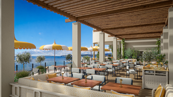 Pour cette renaissance, une partie de la rénovation a été confiée à Dorothée Delaye. Son parti pris est celui d’une réinterprétation de la Belle Époque, caractérisée par des colonnes épurées, un fer forgé aux courbes aériennes, une marqueterie de bois noble en écho aux Riva de la baie, des jaunes solaires et des jacquards bleu azur. Des espaces pensés comme des tableaux de vie et de partage, où la lumière azuréenne devient matière.