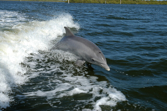 - Grand dauphin (Tursiops truncatus) surfant dans le sillage d'un bateau de recherche
