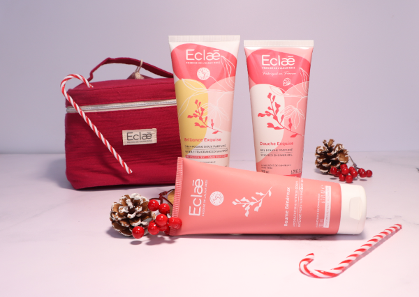 Pour les fêtes de fin d’année, Eclaé, propose son nouveau Coffret Vanity Noël, pensé comme un compagnon élégant et durable. On y trouvera trois soins, conçus et fabriqués en France. Un shampoing doux, sans sulfates ni silicones, formulé à 95 % d’ingrédients naturels (algue rose, aloe vera et huile de noyau d’abricot) qui ne laissera pas le cuir chevelu sec. Un soin nourrissant et raffermissant, enrichi en algue rose, criste marine et beurres végétaux. Un gel douche très légèrement parfumé qui nettoie avec douceur, même les peaux sensibles.