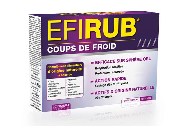 On l’utilisera par voie orale en diluant 1 sachet de EFIRUB® dans une quantité suffisante d'eau ou de jus de fruits : adultes 1 sachet, 3 fois par jour ; enfants à partir de 3 ans : 1 sachet, 1 à 2 fois par jour. Exclusivement en pharmacies et parapharmacies – en boîte de 16 sachets – 8,80 €.