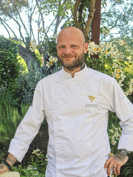 À la tête des cuisines du Domaine du Mas de Pierre, Rodolphe Loury insuffle une dynamique nourrie par un parcours dans les plus grandes maisons. Formé au lycée hôtelier Auguste Escoffier, le chef débute sa carrière dans des établissements de prestige, dont le Royal Monceau avec Jocelyn Herland, son père spirituel et mentor, avant de passer plus de 20 ans dans l’univers exigeant des palaces parisiens. En 2018, sur proposition d’Alain Ducasse, il rejoint l’Hôtel de Paris, à Monaco, afin d’approfondir sa connaissance de la cuisine méditerranéenne. Il y enrichit sa vision culinaire en collaborant avec de grands noms de la gastronomie, tels que Gérald Passédat (Le Petit Nice, Marseille), Mauro Colagreco (Mirazur, Menton) et Arnaud Faye (La Chèvre d’Or, Èze). Rodolfe explique : « Ce qui m’anime, c’est de raconter une histoire à travers une assiette. Une histoire de saison, de terroir, mais aussi de mémoire. Je crois en une cuisine lisible, respectueuse, qui ne triche pas. Ici, au Domaine du Mas de Pierre, j’ai trouvé un cadre d’expression unique pour allier exigence gastronomique et esprit de partage, au cœur d’un territoire d’une richesse exceptionnelle. Le lien direct avec la nature, la présence du potager et du Jardin des Senteurs ont été déterminants dans mon choix : ils nourrissent ma créativité au quotidien et m’invitent à une cuisine de naturalité, centrée sur l’essence du produit et le respect de son cycle. »