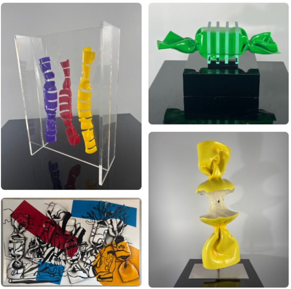 Elle débute ses recherches artistiques au milieu des années 90 où elle expérimente différentes techniques lui permettant de maîtriser le plexiglas et de créer une technique qui lui est popre. La torsion ou wrapping : littéralement l’enroulement de la matière sur elle-même associée à la torsion de la papillote. Grâce à elle, elle crée la sculpture Bonbon qui est devenue sa signature artistique. Depuis près de 20 ans elle sculpte des bonbons aux couleurs éclatantes dans des matériaux tels que le bronze, le plexiglas, l’aluminium, le marbre, le polyester ou encore le Verre de Murano.