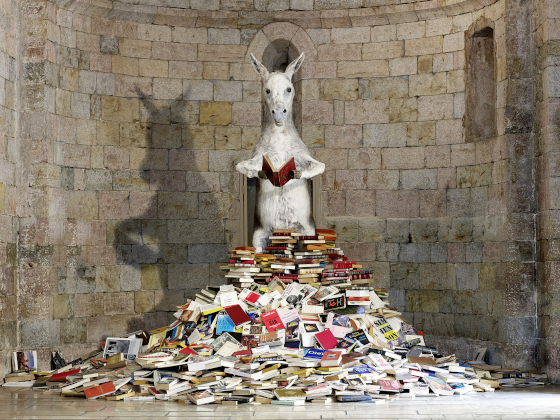 La part de l'art contemporain est également bien représentée avec Asneria, l'installation de Pilar Albarracin qui montre un âne trônant au dessus d'un monticule de livres - qu'on imagine voués à un prochain autodafé. Quant à Abraham Poincheval, il nous offre une réplique très personnelle de l'armure don-quichottesque, avec coquillages et végétaux intégrés. Il est également le co-auteur, avec Matthieu Verdeil, d'une cocasse performance filmée, Le chevalier errant, l'homme sans ici (2018). Et comment ne pas faire une halte dans la reconstitution de la grotte de Montesinos où Don Quichotte a la vision de sa Dulcinée en mendiante ?